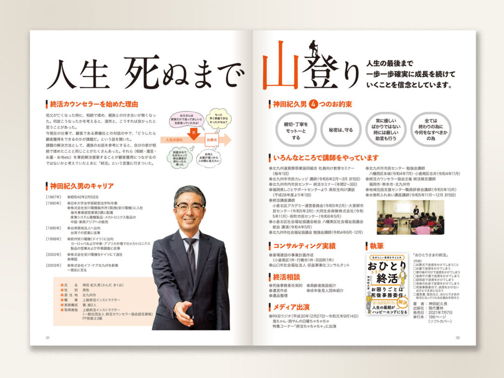 お客様に信頼と安心感を感じていただくため、代表者である神田様を主役にした個人ブランドパンフレットを制作。