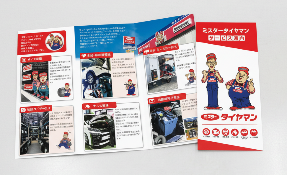 このパンフレットは、タイヤ交換だけでなく、車に関するあらゆる悩みを相談できるお店であることを伝えるために制作しました。親しみやすいキャラクターと、サービス内容の分かりやすさを重視しています。