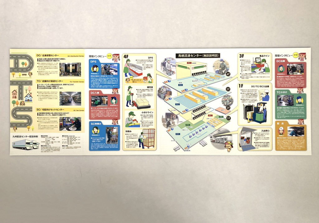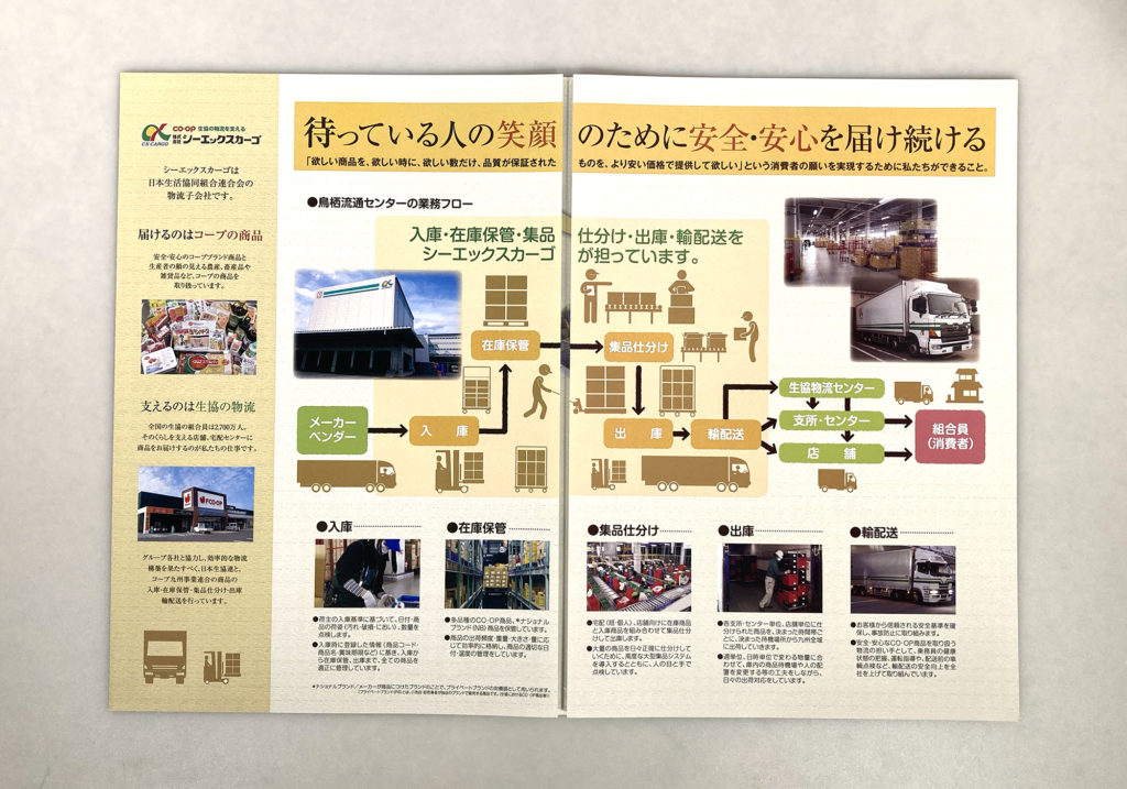 弊社は、主に生協(生活協同組合)で取り扱う商品の保管、宅配・店舗向けの商品の仕分けを行っている物流会社です。センターの見学には、生協を利用している組合員さんが毎年たくさんお見えになります。10年前のセンター開設時に、見学用のパンフレット・DVDを制作し、現在まで活用していましたが、大型設備や仕組みなどの専門的な説明が中心で、初めての方には理解しにくい内容となっていました。