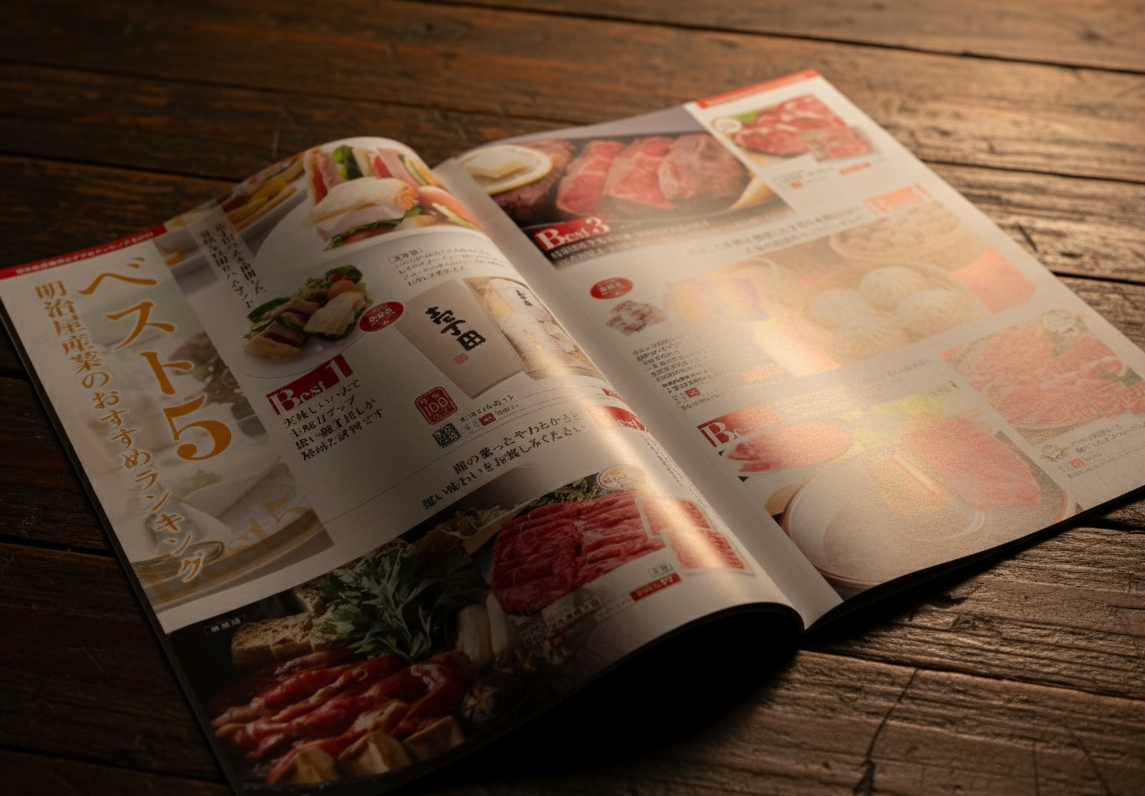 完成したウインターギフトカタログは、お客様に精肉ギフトを選ぶ楽しさを提供するツールとなりました。魅力的な企画ページの挿入と、商品の視認性を高めるレイアウトにより、カタログ全体が「読み物」としての付加価値を持ち、お客様は楽しみながら商品を選ぶことができるようになっています。これにより、明治屋産業様のこだわりや想いを効果的に伝え、顧客満足度の向上と購買意欲の喚起に貢献しました。