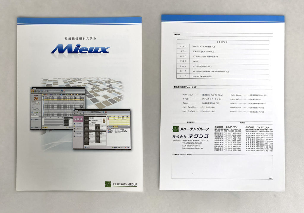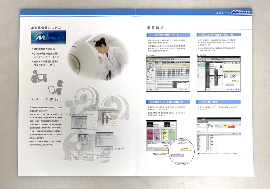 このパンフレットは、システムの機能やメリットを分かりやすく伝えるだけでなく、医療現場の効率化に貢献する私たちの姿勢を、視覚的に伝えるための重要なツールです。
