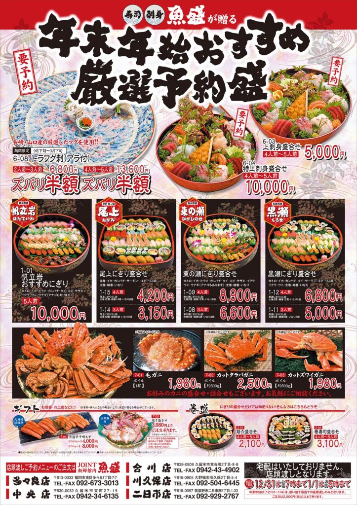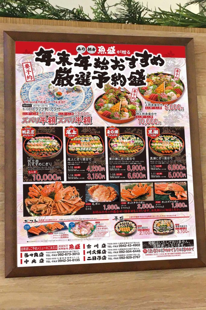 鮮魚専門店「魚盛」様より、年末年始の繁忙期に向けた集客を目的としたポスター制作をご依頼いただきました。家族や親戚が集まる特別な時期に、新鮮で豪華な海の幸を食卓に届けるというメッセージを、視覚的に魅力的に伝える必要がありました。